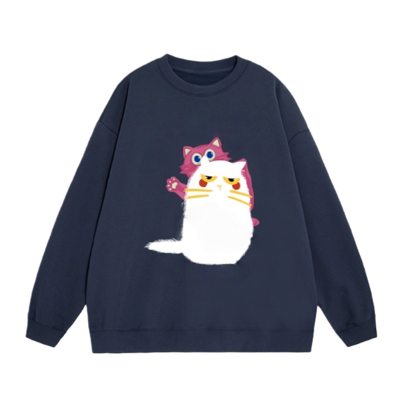 Cartoon Cat Print Creative Sweatshirt In Navy Blue